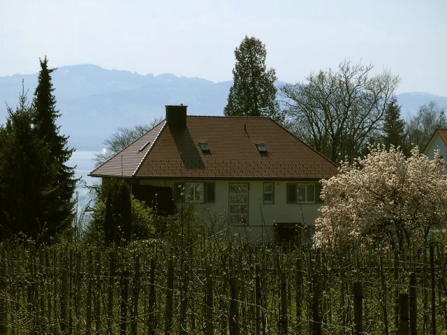 Anblick von Norden, im Hintergrund See und Berge